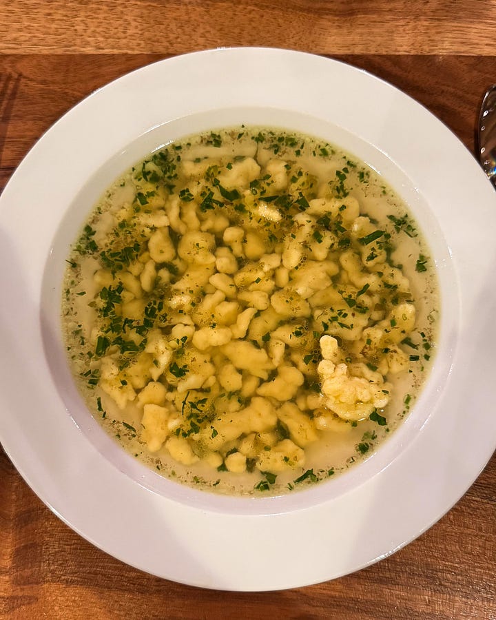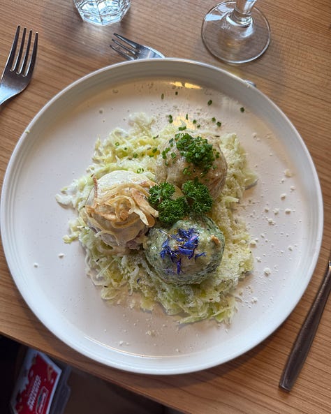 Giada De Laurentiis lol, at Gostner Schwaige. Both an inn, farm, cheese dairy, apres-ski spot, and generally stunning destination in upper Bolzano. Stanley Tucci has filmed there too, so you know it’s worth a visit. Some exceptional things I tasted were their dumplings (pictured below), sweet knödel (in my video with Giada), and their cultured yogurt butter, which was tangy, rich and delicious.