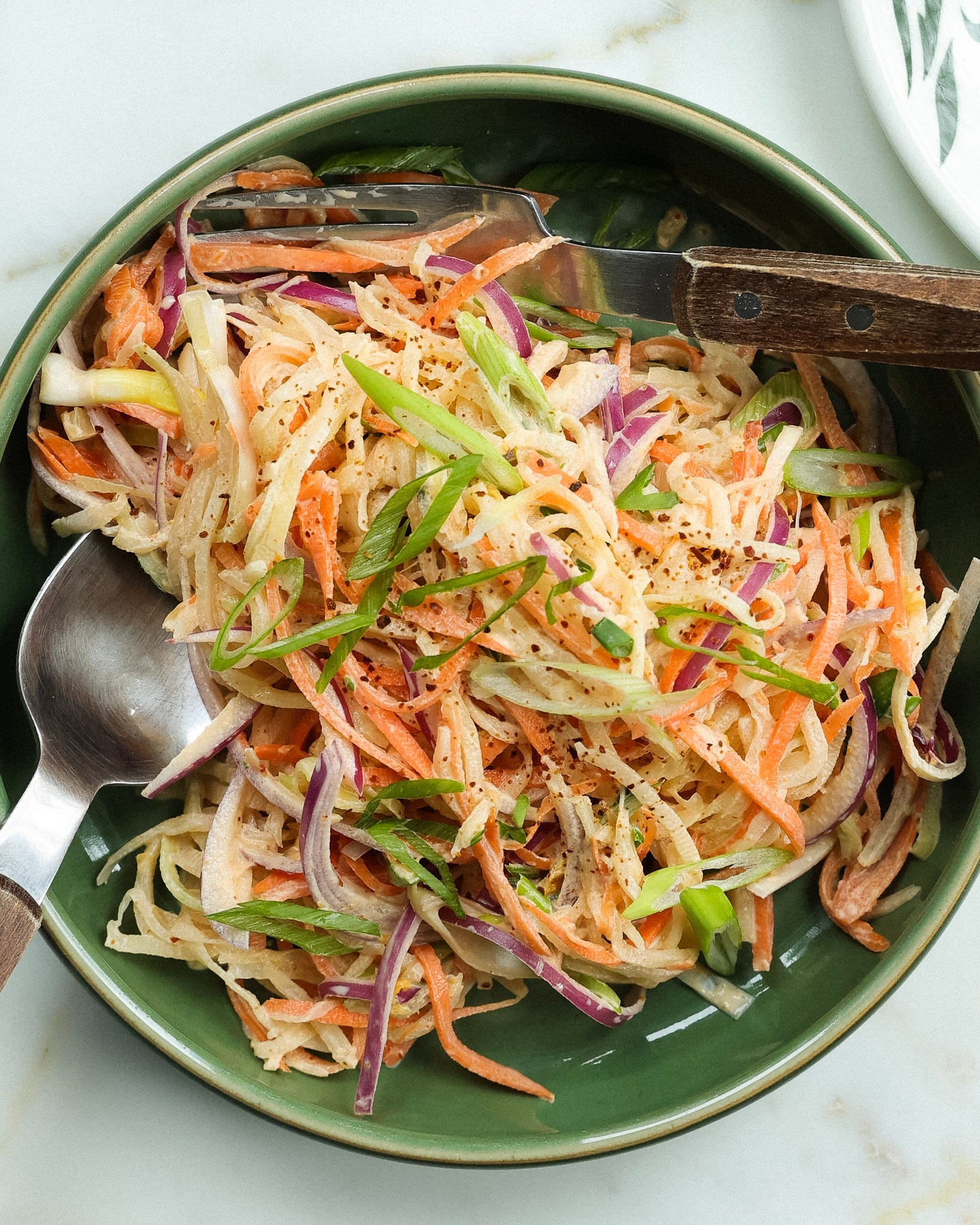 Daikon Radish Slaw - UGH I LOVE THIS ONE. If you also frequent Lani’s Farm stand at the market, you know they have daikons for days this time of year. This slaw is a quick way to make them craveable. You squeeze out any excess water, mix them with a creamy kimchi dressing, and then they are ready to pair with any protein + rice combo.